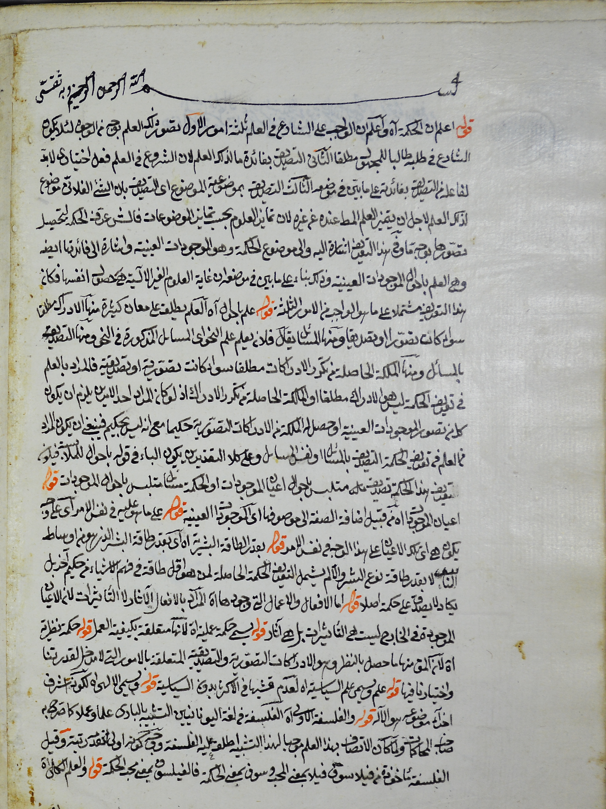 $aأّوله : قوله: إعلم إَّن الحكمة آه وأعلم ان الواجب على الشارع في العلم ثلاثة أمور، الأّول: تصور ذلك العلم بوجه من الوجوه لئلا يكون الشارع في طلبه...