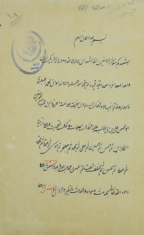 أّوله : اشهدكم معاشر المؤمنين، إني اشهد ان لا إله الا الله وحده لا شريك له، إلهًا واحدًا أحدًا فردًا صمدًا، حيًا قيومًا، لم يتخذ صاحبة ولا ولدًا.