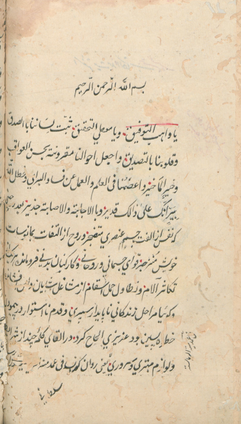 $aأول النسخة : ويامعطي التحقيق، ثبت لنا لساننا بالصدق، وقلوبنا بالتصديق، وأجعل أحوالنا مقرونة بحسن العواقب والخير، وأعصمنا في العلم والعمل عن فساد.
