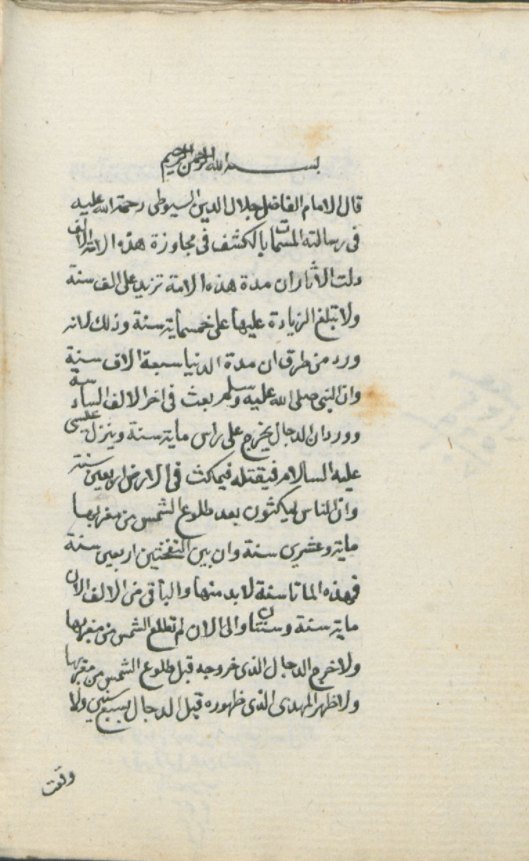 اوله : قال الامام الفاضل جلال الدين السيوطي : دلت الآثار أن مدة هذه الأمة تزيد على الألف سنة، ولا تبلغ الزيادة عليها على خمسمائة سنة...