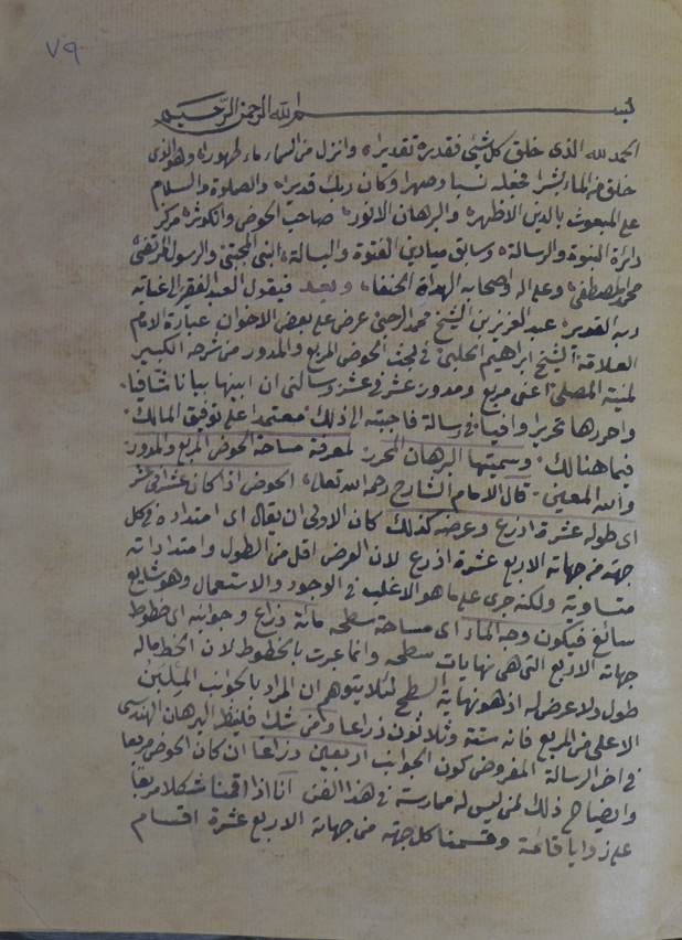 $aأوله : الحمد لله الذي خلق كل شئ فقدره تقديرًا، وانزل من السماء ماًء طهورا، وهو الذي...وبعد فيقول العبد الفقير الى عناية ربه القدير عبد العزيز بن الشيخ محمد الرحبي...