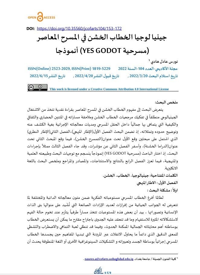 جينيا لوجيا الخطاب الخشن في المسرح المعاصر : مسرحية YES GODOT أنموذجاً = The genealogy of rough discourse in contemporary theatre : YES, GODOT play as a model / نورس عادل هادي.