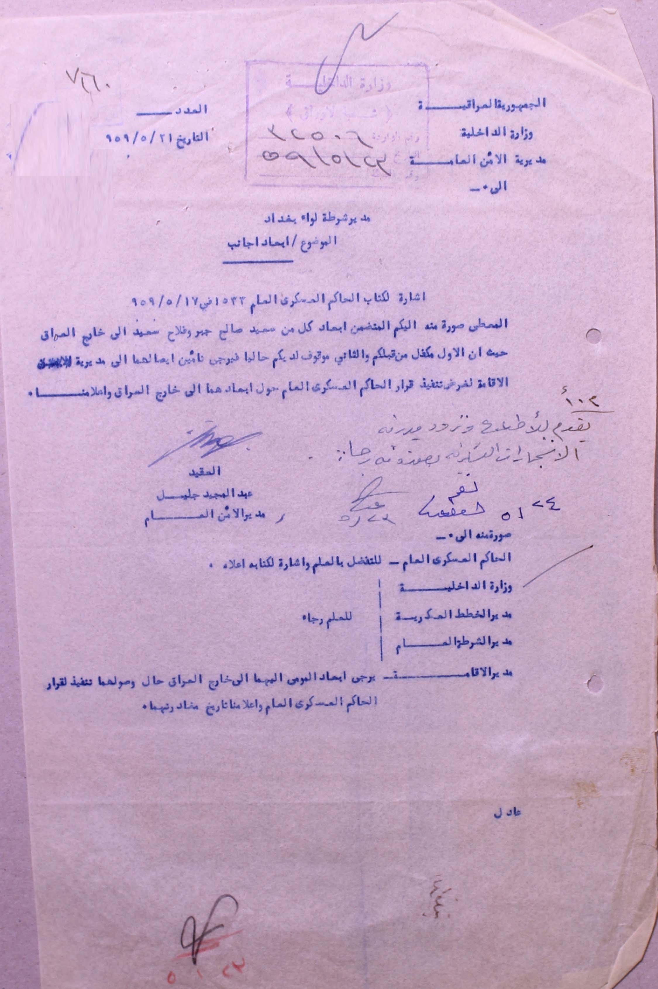 ابعاد الاجانب كل من سعيد صالح جهر وفلاح سعيد الى خارج العراق.