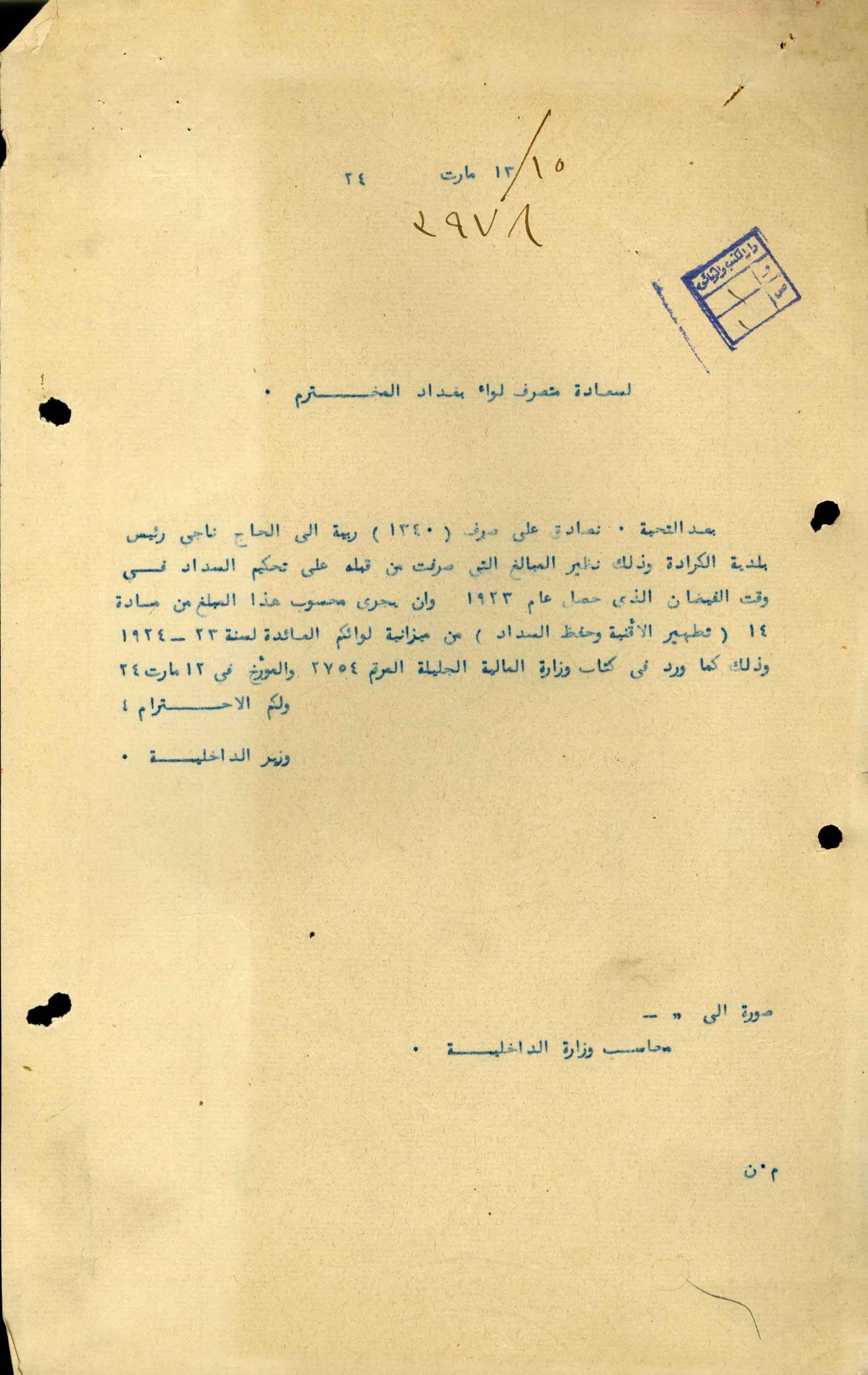 [صرف مبلغ 1340 ربيه الى الحاج ناجي رئيس بلدية الكرادة لغرض تحكيم السدا وقت الفيضان]