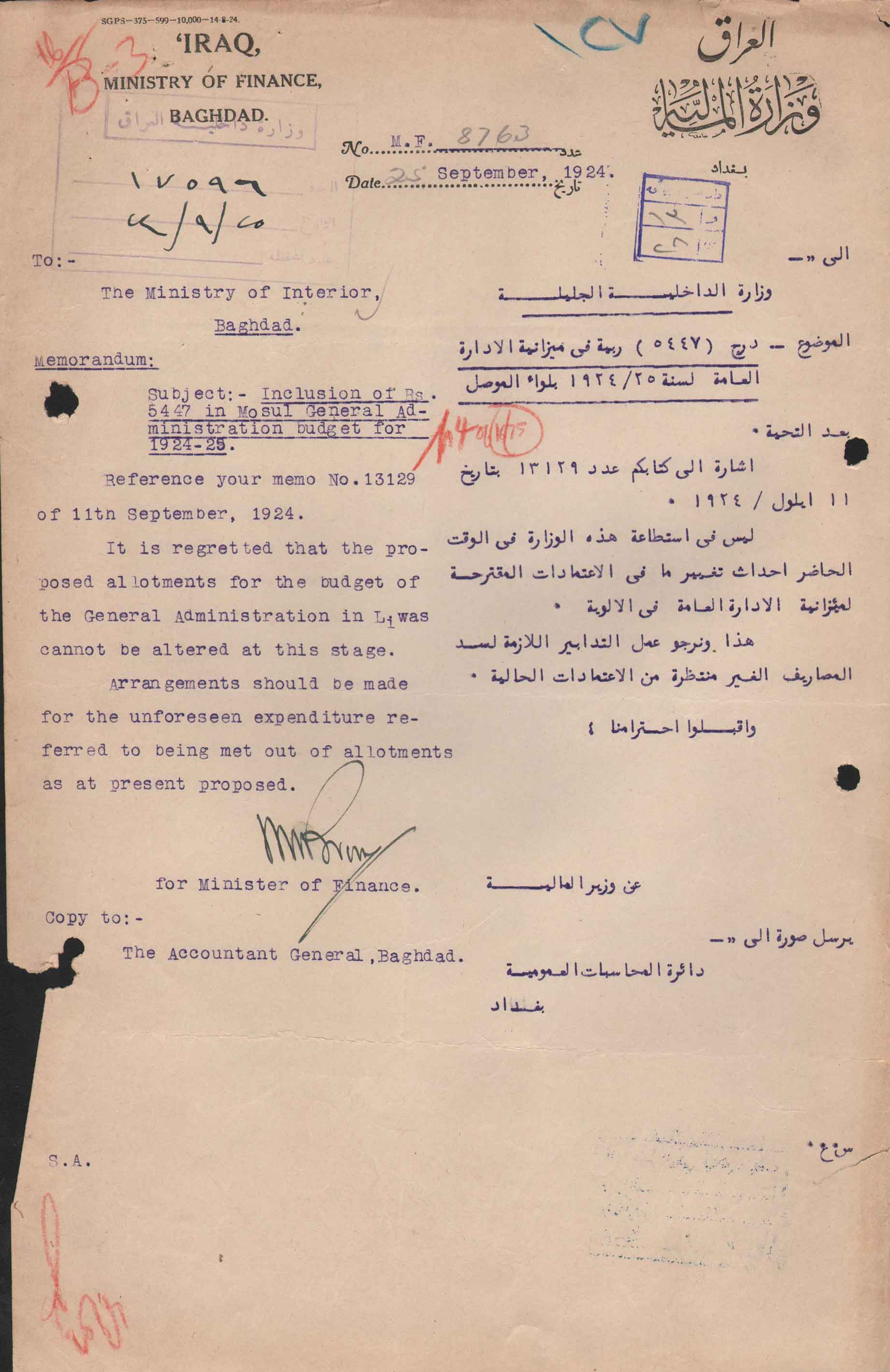 درج (5447) ربية في ميزانية الادارة العامة لسنة 1924/25 بلواء الموصل