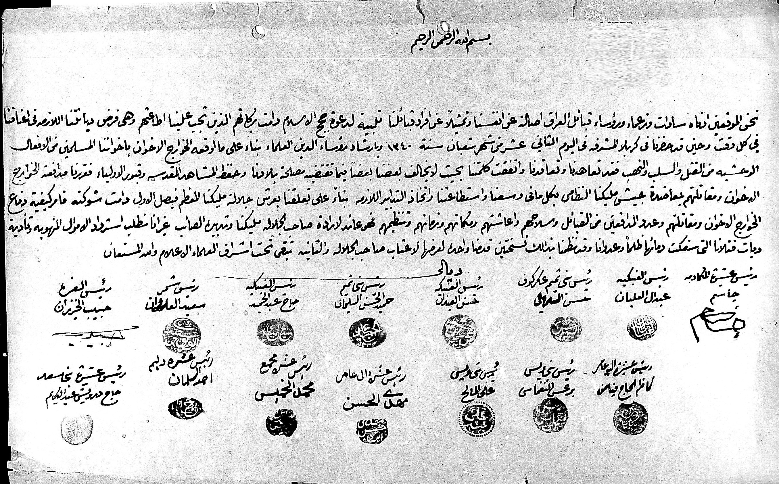 [سادات وزعماء ورؤساء قبائل العراق في ديالى الحضور الى كربلاء من اجل دعوة حجج الاسلام بسبب ما فعله الخوارج الاخوان في العتبات المقدسة من تخريب]