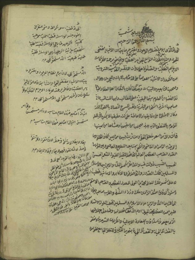 $aأوله : الحمد لله الذي ابدع نظام الوجود واخترع لماهيات الاشياء بمقتضى الوجود وانشأ بقدرته انواع الجواهر العقلية...اما بعد فهذا كتاب في المنطق وسميته بالرسالة الشمسية...