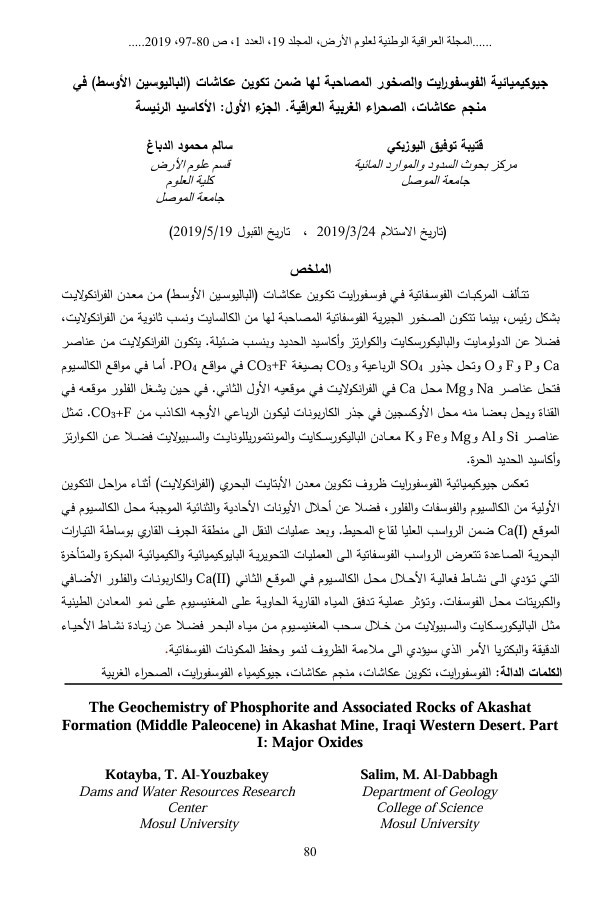 جيوكيميائية الفوسفورايت والصخور المصاحبة لها ضمن تكوين عكاشات الباليوسين الأوسط) في منجم عكاشات الصحراء الغربية العراقية. الجزء الأول، الأكاسيد الرئيسة = The Geochemistry of Phosphorite and Associated Rocks of Akashat Formation (Middle Paleocene) in Akashat Mine, Iraqi Western Desert. Part I، Major Oxides / قتيبة توفيق اليوزبكي، سالم محمود الدباغ.