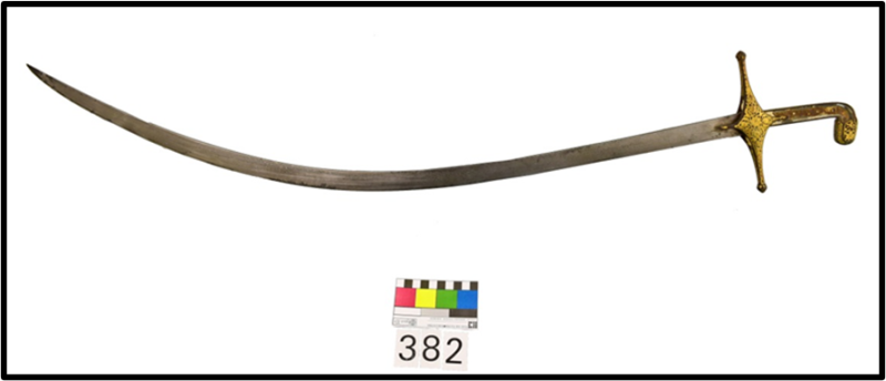 سيف مصنوع من حديد الجوهر من عمل اسد الله ويوجد عليه وقفية (وقف روضة ابوالفضل العباس).
