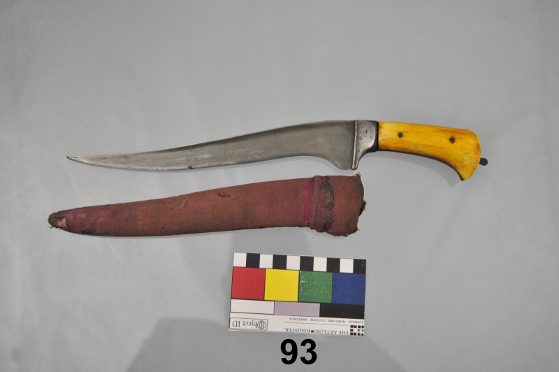 خنجر مصنوع من الحديد والقبضة من الحديد مغلفة بعظم والنصل ذو حدين مصنوع من الحديد الجوهر ذو راس مدبب.