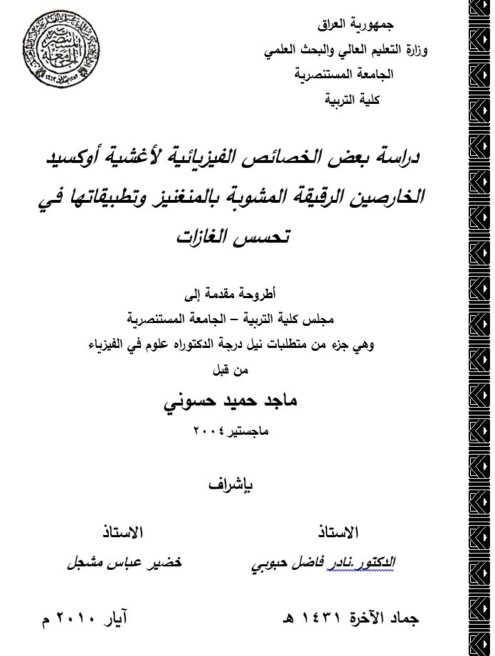 $aدراسة بعض الخصائص الفيزيائية لأغشية أوكسيد الخارصين الرقيقة المشوبة بالمنغنيز وتطبيقاتها في تحسس الغازات = $bStudy of some physical properties of Mn doped ZnO thin films for gas Sensing applications / $cمن قبل ماجد حميد حسوني ؛ بإشراف الاستاذ الدكتور نادر فاضل حبوبي، الاستاذ خضير عباس مشجل.