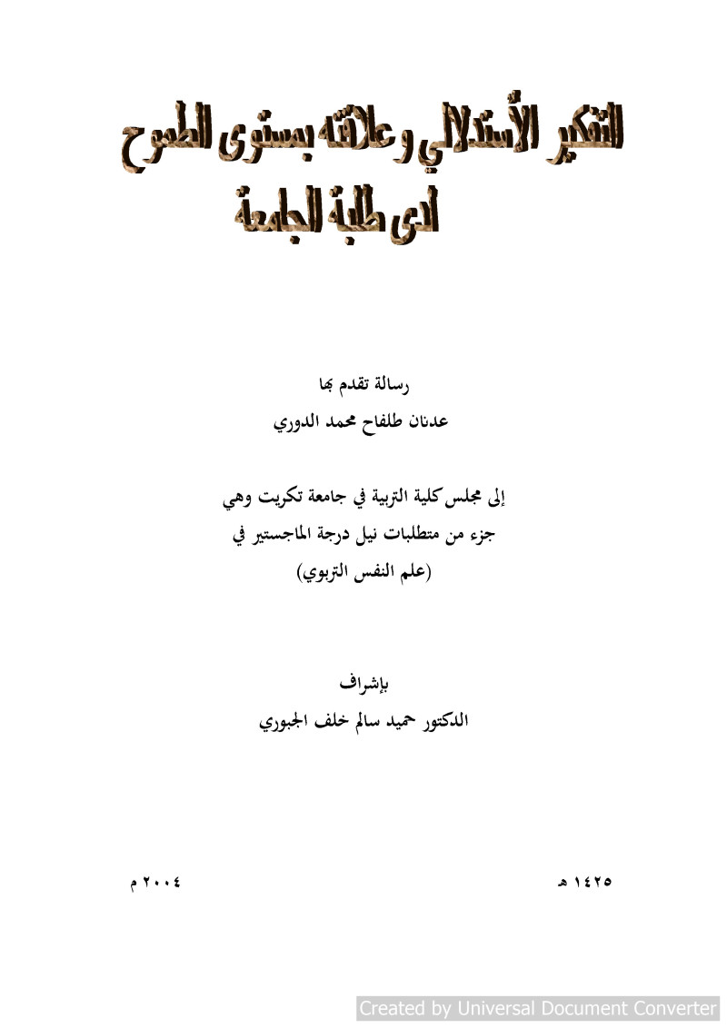التفكير الاستدلالي وعلاقته بمستوى الطموح لدى طلبة الجامعة = University of Tikrit in Partial Fulfillment of The Requirements For The Degree Of Maser Education in Educational Psychology / رسالة تقدم بها عدنان طلفاح محمد الدوري ؛ بإشراف الدكتور حميد سالم خلف الجبوري.