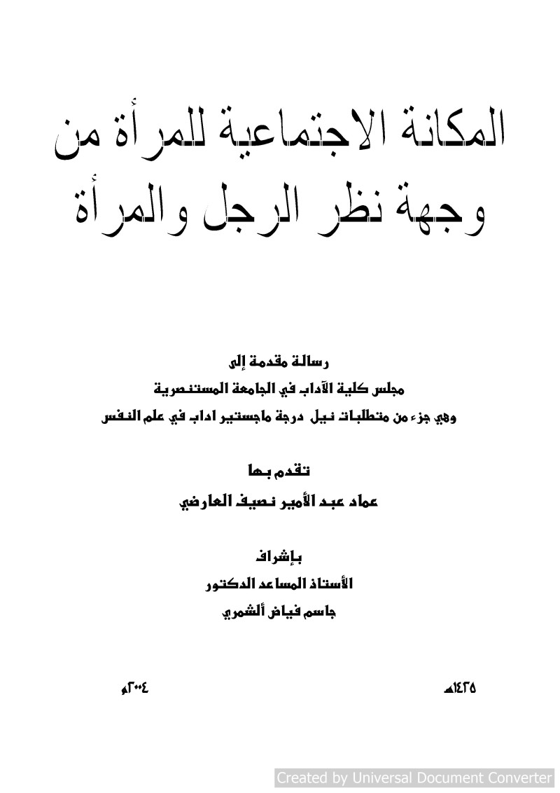 المكانة الاجتماعية للمرأة من وجهة نظر الرجل والمرأة = Social Status of Iraqi Woman From the Point of View of Man & Woman / تقدم بها عماد عبد الأمير نصيف العارضي ؛ بإشراف الأستاذ المساعد الدكتور جاسم فياض ألشمري.