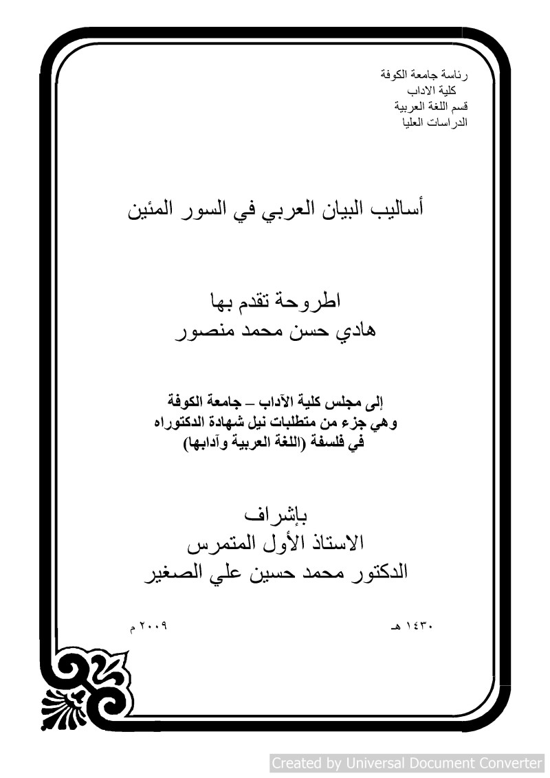 أساليب البيان العربي في السور المئين = Methods of Arabic Eloquence in the Hundred Verse Suras / اطروحة تقدم بها هادي حسن محمد منصور ؛ إشراف الاستاذ الأول المتمرس الدكتور محمد حسين علي الصغير.