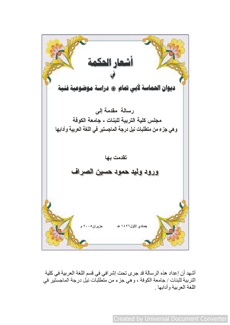 أشعار الحكمة في ديوان الحماسة لأبي تمام : دراسة موضوعية فنية = Wisdom poetries in Enthusiasm (AL-Hamassa) Divan For Abi – Tammam : Asubjective , Technical Study / من قبل ورود وليد حمود حسين الصراف ؛ إشراف الأستاذ الدكتور سعيد عدنان المحنة.