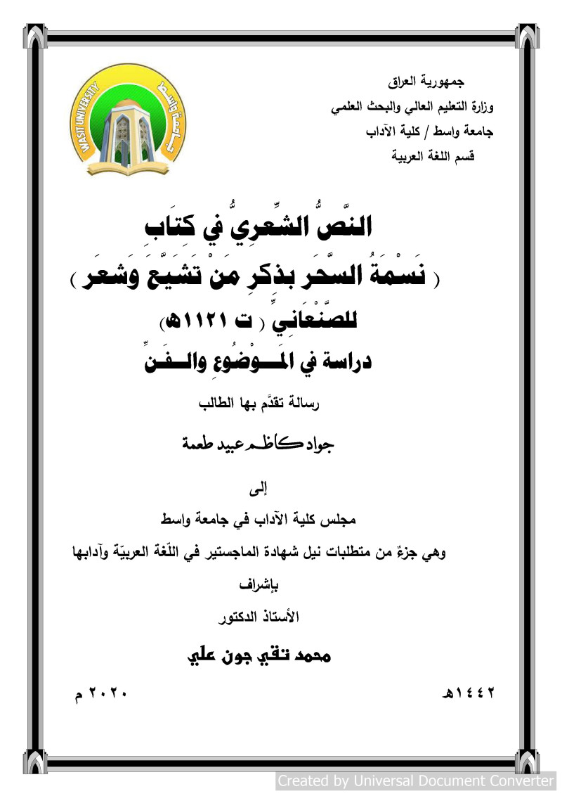 جامعة واسط (العراق). كلية الآداب. قسم اللغة العربية، المؤسسة المانحة للدرجة.