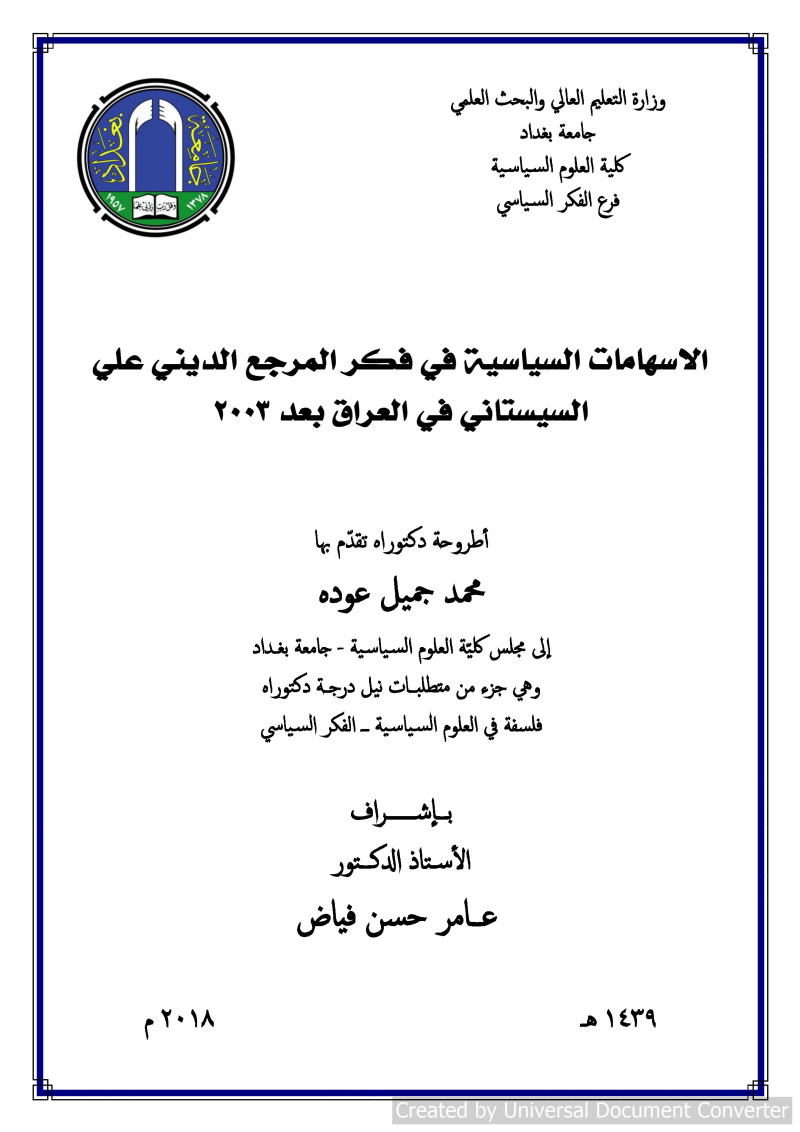 الاسهامات السياسية في فكر المرجع الديني علي السيستاني في العراق بعد ٣٠٠٢ = Political Contributions in the Thought of the Religious leader Ali al-Sistani in Iraq after 2003 / محمد جميل عوده ؛ بإشراف الأستاذ الدكتور عامر حسن فیاض.