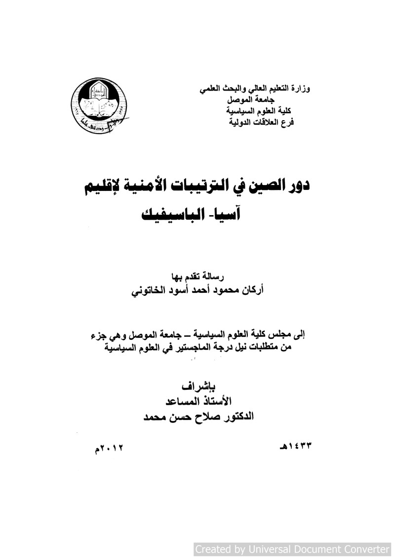 دور الصين في الترتيبات الأمنية لإقليم أسيا - الباسيفيك = The Role of China in the Security Arrangements for the Asia-Pacific Region / أركان محمود أحمد أسود الخاتوني ؛ بإشراف الأستاذ المساعد الدكتور صلاح حسن محمد.