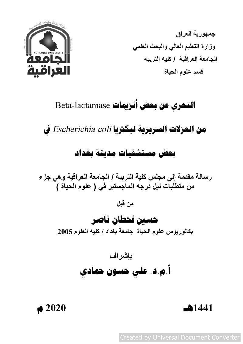التحري عن بعض أنزيمات Beta-lactamase من العزلات السريرية لبكتريا Escherichia coli في بعض مستشفيات مدينة بغداد = Investigation of Some beta-lactamase enzymes from the clinical of Esherichia coli In some hospitals in Baghdad City / من قبل حسين قحطان ناصر ؛ بإشراف أ. م. د. علي حسون حمادي.