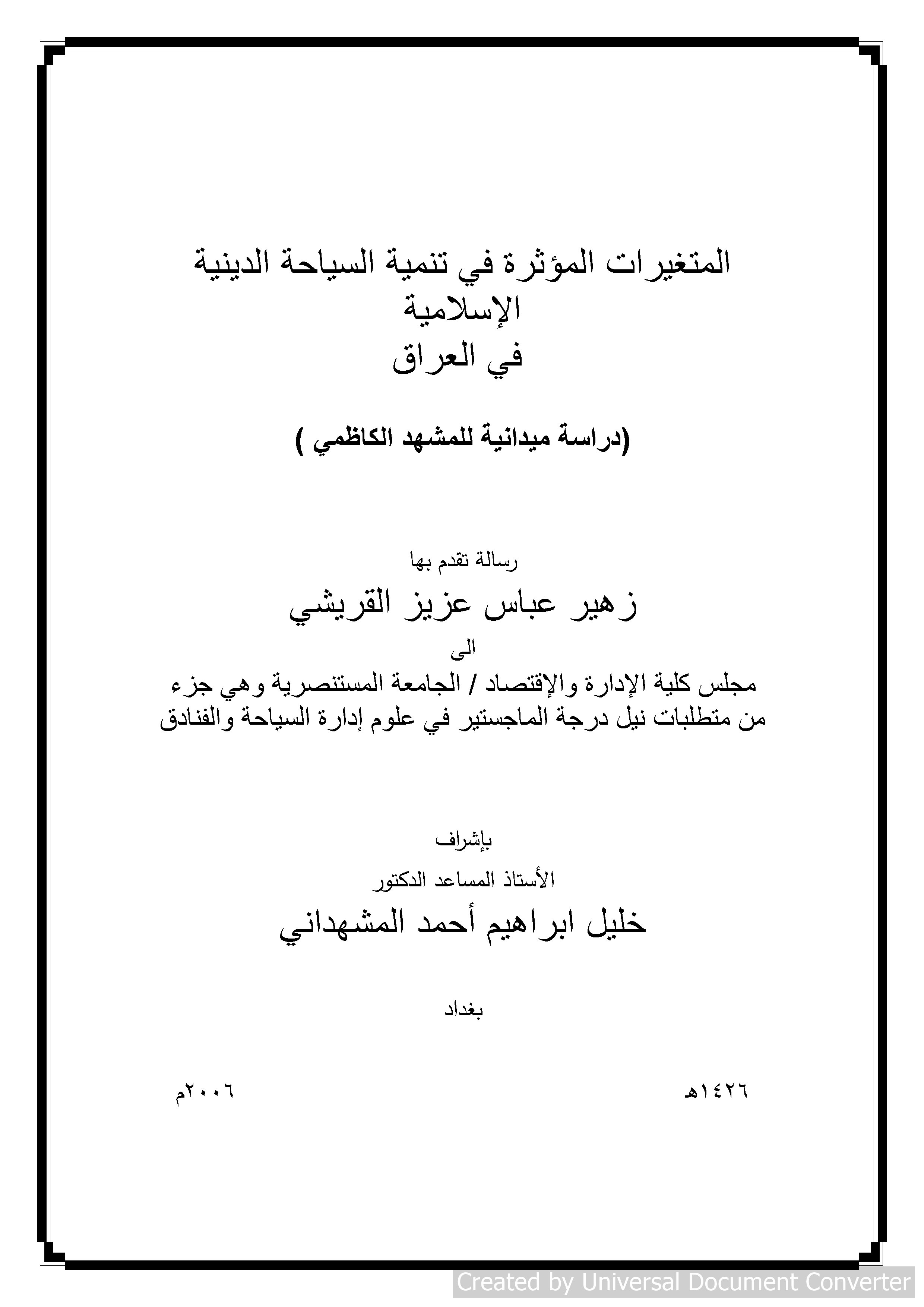 $aالمتغيرات المؤثرة في تنمية السياحة الدينية الإسلامية في العراق : $b(دراسة ميدانية للمشهد الكاظمي) = Variables affecting in development the Islamic Religious tourism in Iraq (Field study for Kadhimaih Scene) / $cزهير عباس عزيز القريشي ؛ بإشراف الأستاذ المساعد الدكتور خليل ابراهيم احمد المشهداني.