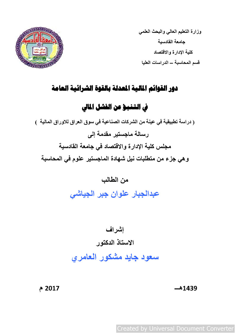 دور القوائم المالية المعدلة بالقوة الشرائية العامة في التنبؤ عن الفشل المالي : (دراسة تطبيقية في عينة من الشركات الصناعية في سوق العراق للاوراق المالية) = The Role of the Revised Financial Statements With general purchasing power In predicting financial failure : (Applied study in a sample of industrial companies in the Iraqi market for securities) / عبد الجبار علوان جبر الجياشي ؛ اشراف الاستاذ الدكتور سعود جايد مشكور العامري.