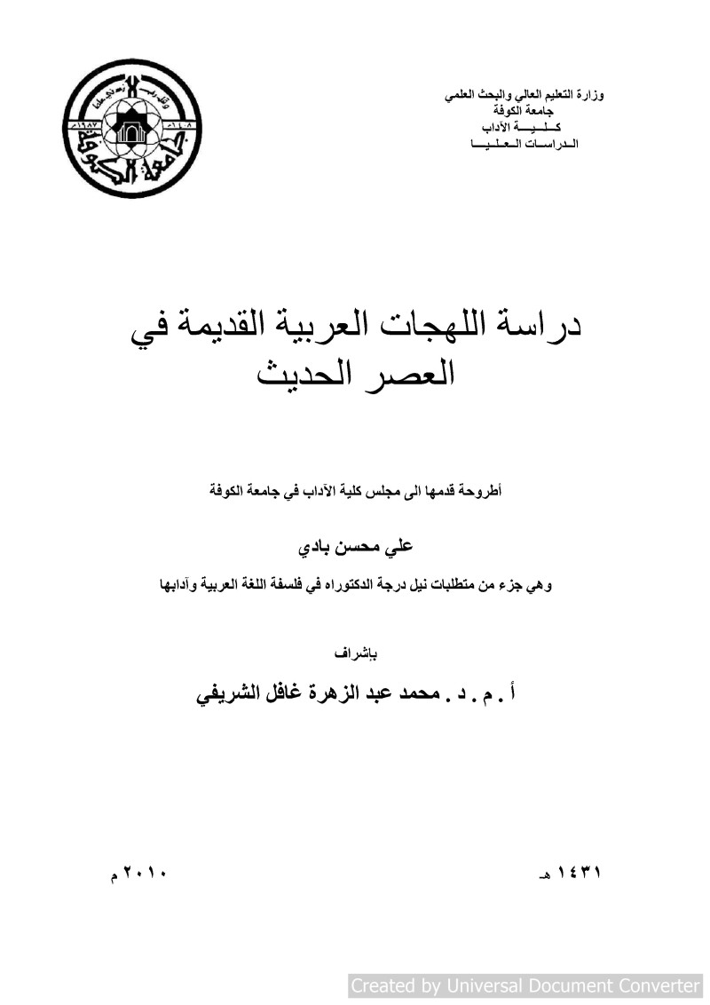 جامعة الكوفة (النجف، العراق). كلية الآداب. قسم اللغة العربية، المؤسسة المانحة للدرجة.