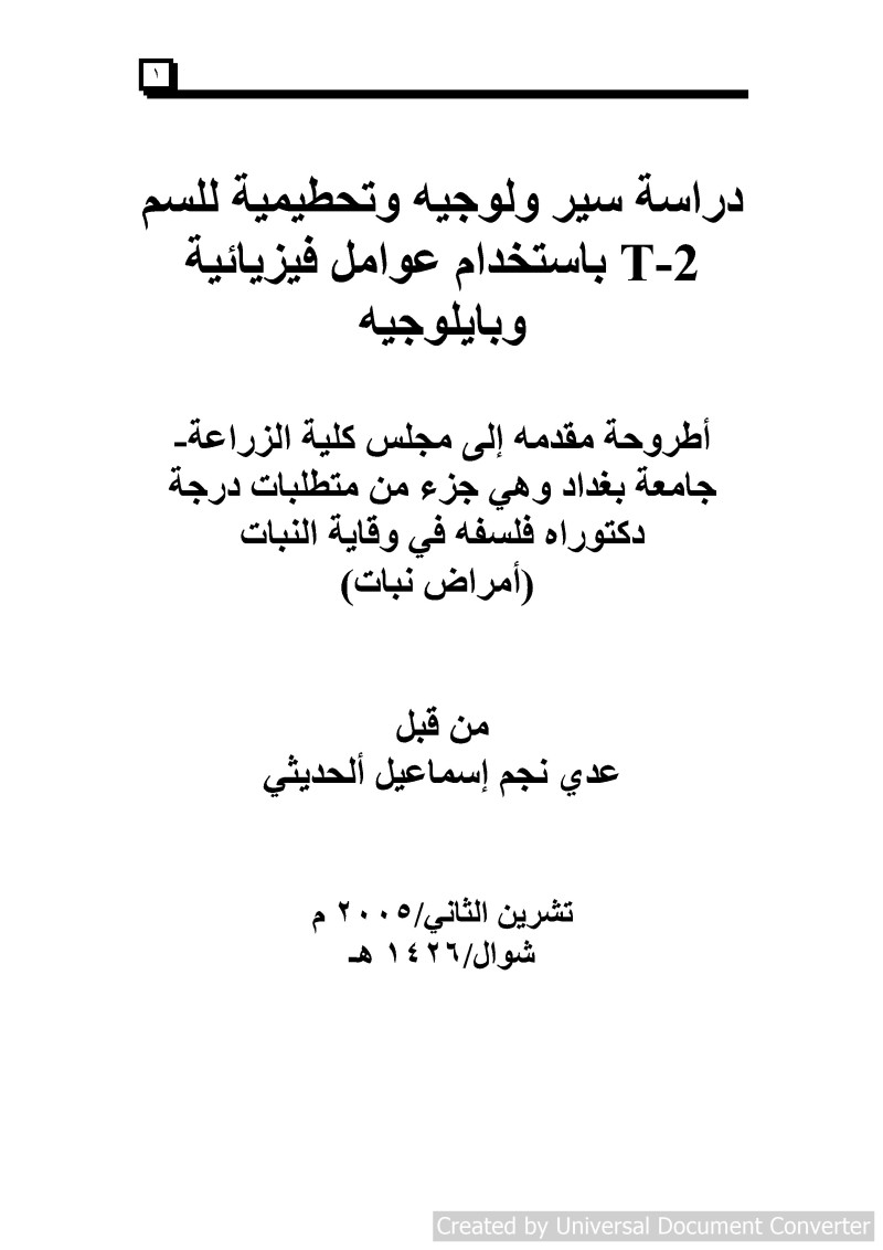 دراسة سير ولوجيه وتحطيمية للسم T-2 باستخدام عوامل فيزيائية وبايلوجيه = Serological and detoxification studies by use physical and biological agent on T2_toxin / من قبل عدي نجم اسماعيل الحديثي ؛ المشرف الاستاذ الدكتور رقيب عاكف العاني.