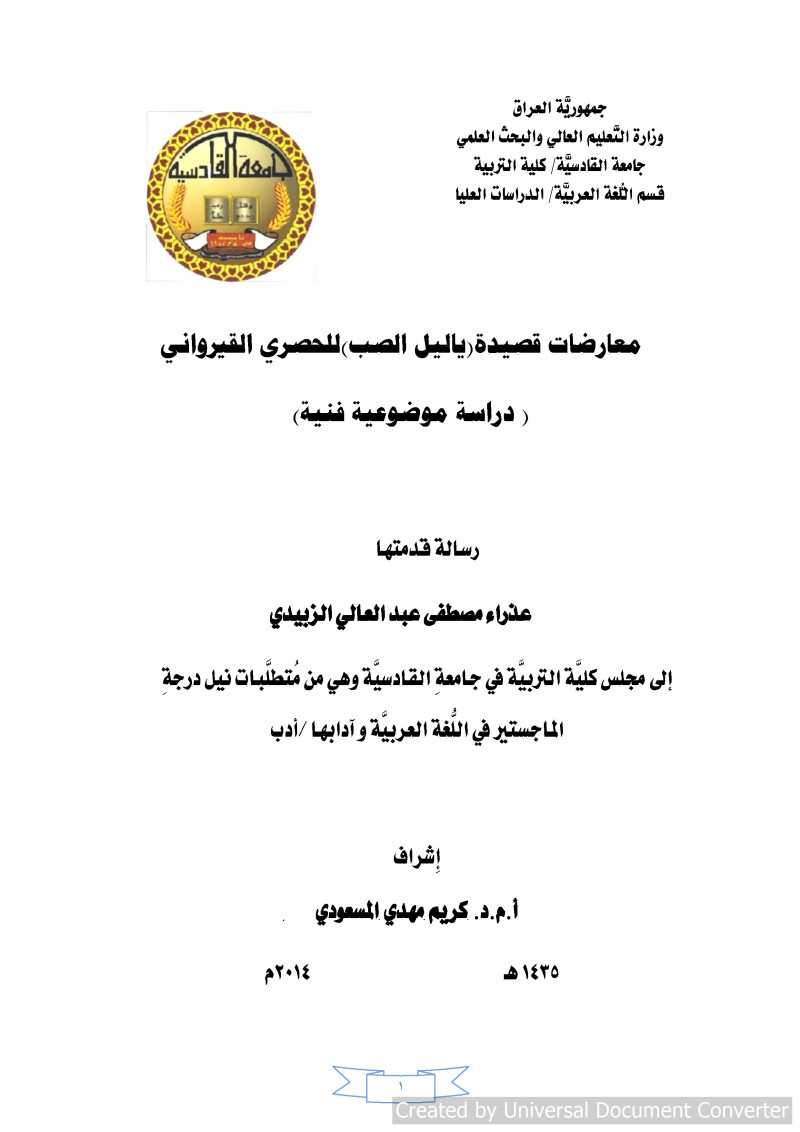 معارضات قصيدة (ياليل الصب) للحصري القيرواني : دراسة موضوعية فنية = The Objection of Layaly AI-Sab Poem For AI-Hasry AI-Qayrawany : Artistic Objective study / عذراء مصطفى عبد العالي الزبيدي ؛ إشراف أ.م.د. كريم مهدي المسعودي.