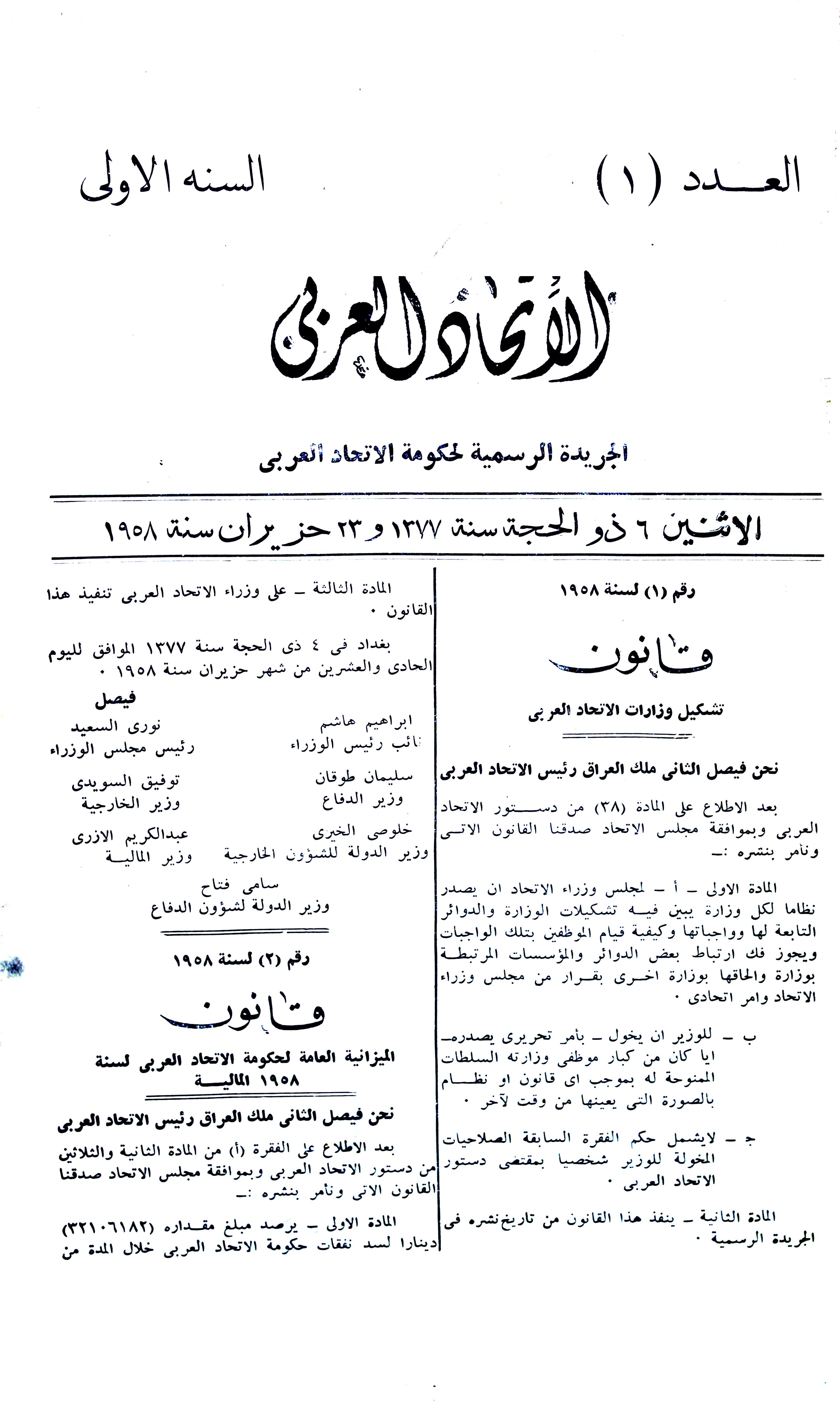 العدد 1، السنة 1 (23 حزيران 1958).