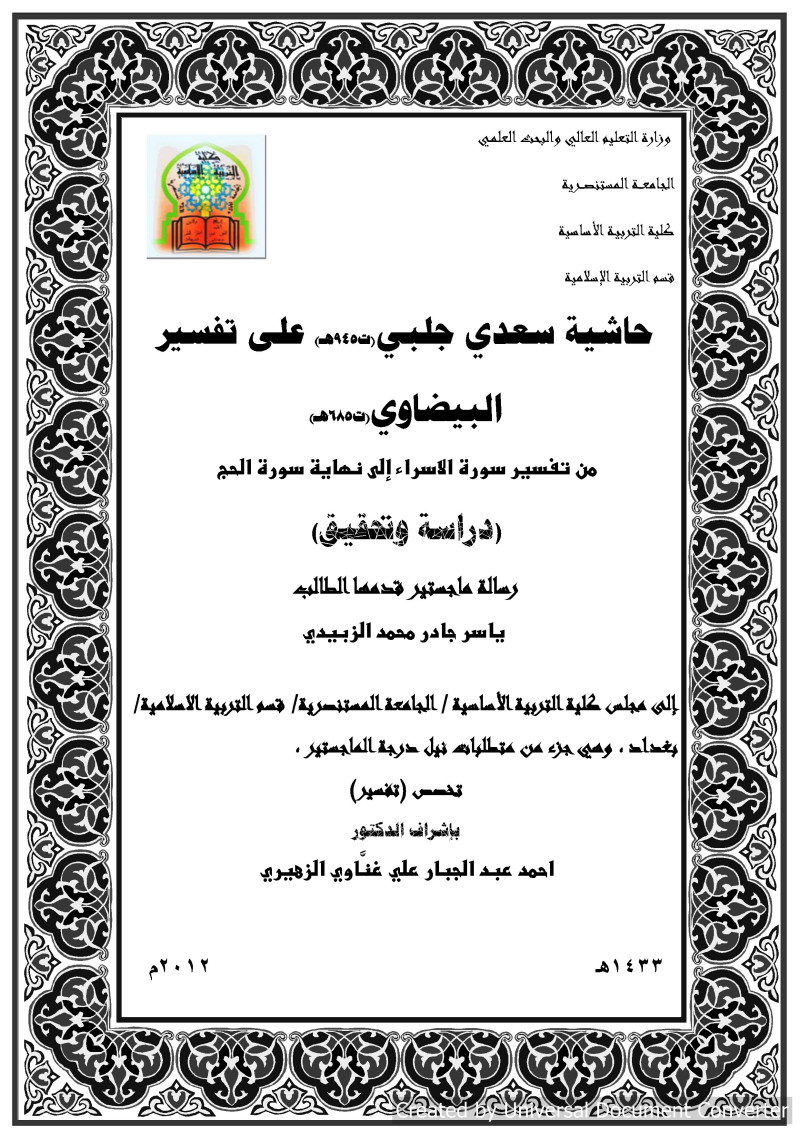 حاشية سعدي جلبي (ت945 هـ) على تفسير البيضاوي (ت 685 هـ) من تفسير سورة الاسراء الى نهاية سورة الحج (دراسة وتحقيق) = Footnote Saadi Chlebi (d. 945 AH) on the interpretation of the Oval (d. 685 AH) The interpretation of Sura Isra to the end of Al-Hajj (Study and investigation) / ياسر جادر محمد الزبيدي.