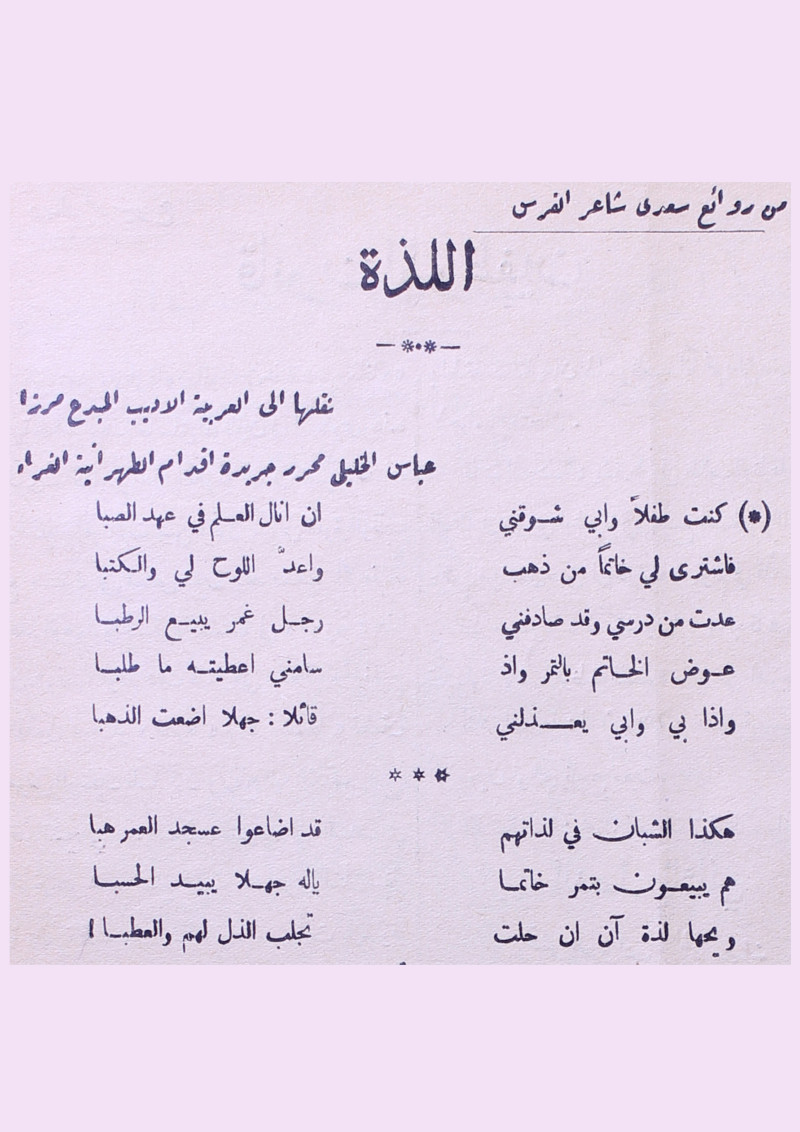 سعدي ؛ نقلها الى العربية الاديب المبدع مرزا عباس الخليلى.