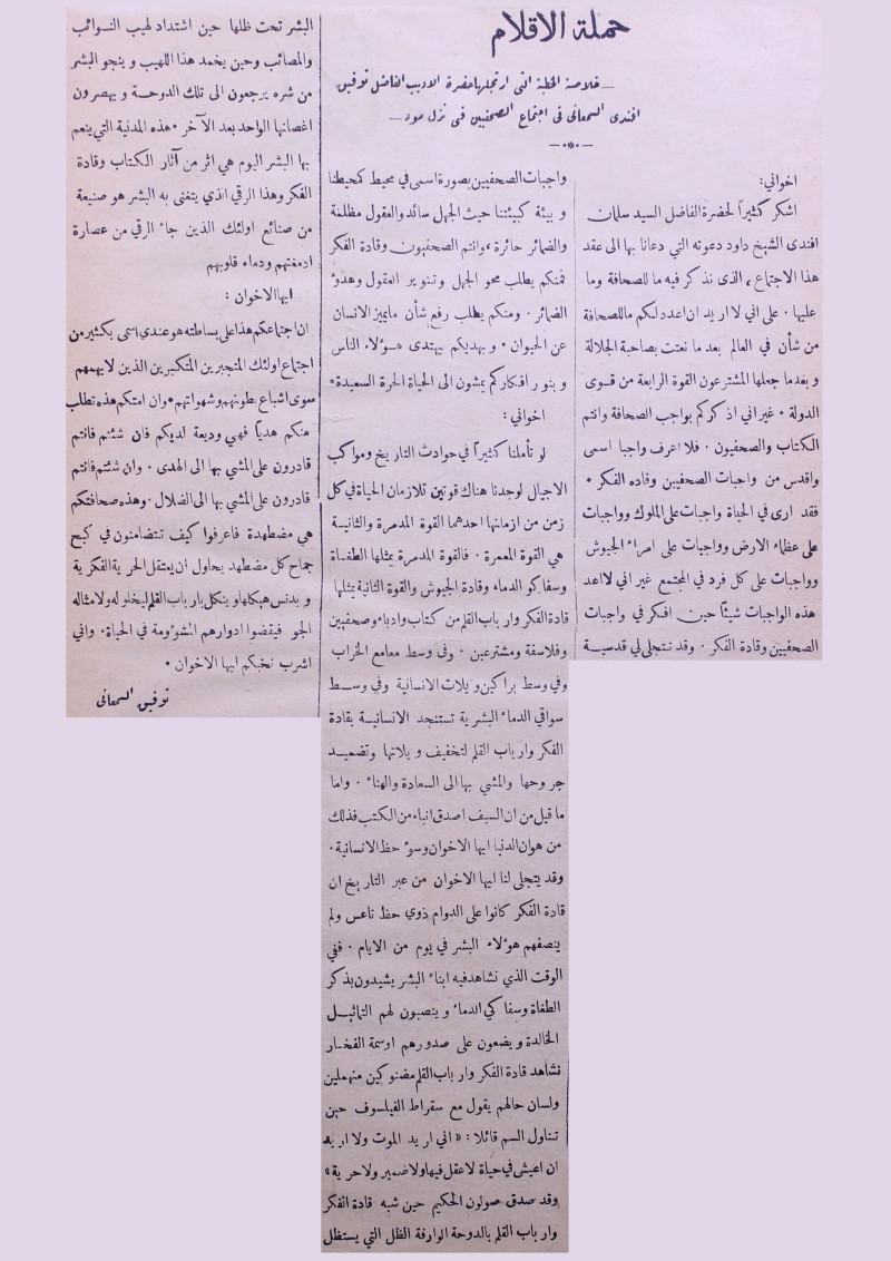 خلاصة الخطبة التي ارتجلها حضرة الاديب الفاضل توفيق افندي السمعاني في اجتماع الصحفيين في نزل مود.