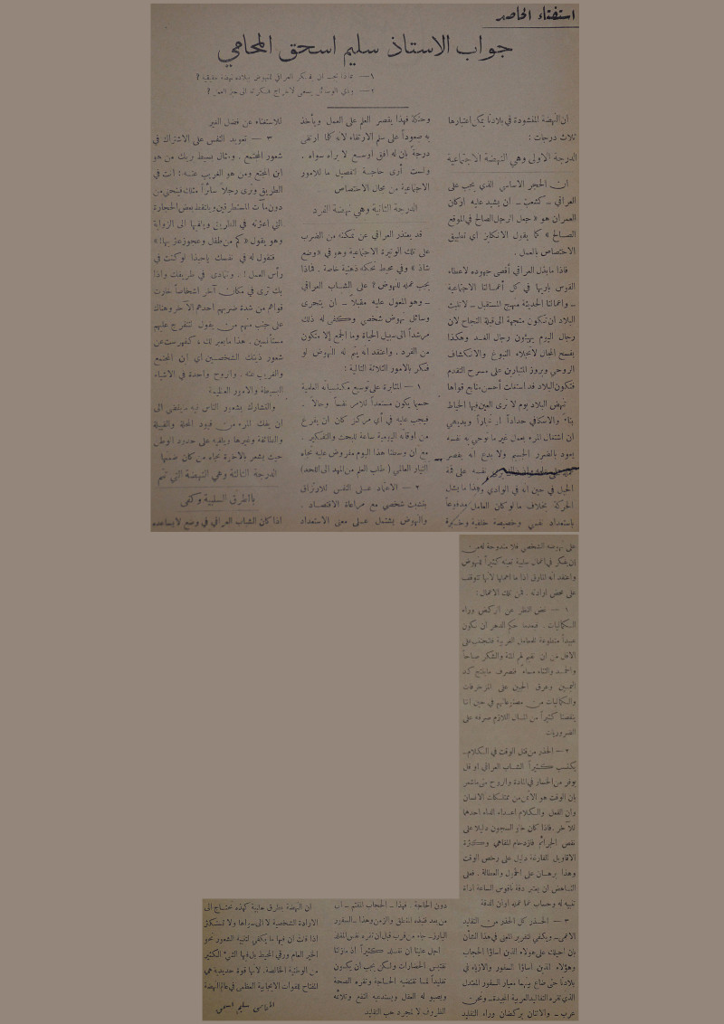 جواب الاستاذ سليم اسحق المحامي : 1- بماذا يجب ان يفكر العراقي للنهوض ببلاده نهضة حقيقية : 2- وبأي الوسائل يسعى لاخراج فكرته الى حيز العمل.