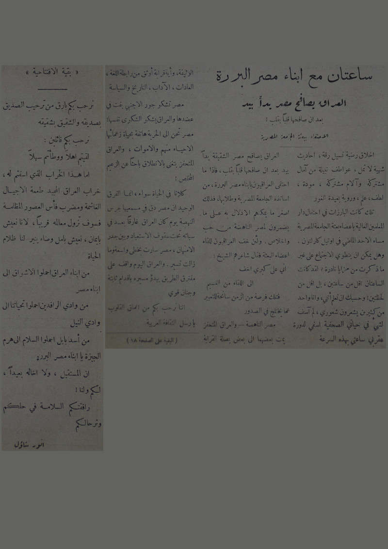 العراق يصافح مصر يدًا بيد بعد ان صافحها قلبًا بقلب : الاحتففاء ببعثة الجامعة المصرية.
