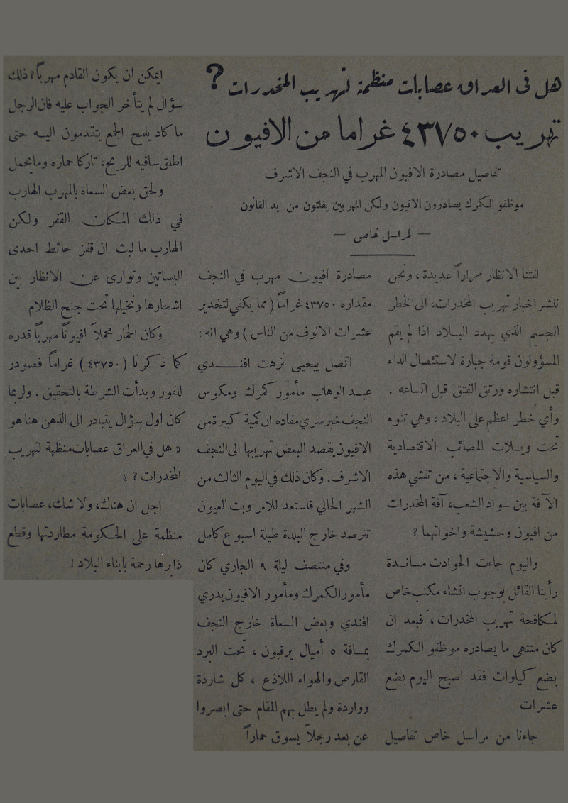 $aهل في العراق عصابات منظمة لتهريب المخدرات : $bتهريب 43750 غراما من الافيون : تفاصيل مصادرة الافيون المهرب في النجف الاشرف : موظفو الكمرك يصادرون الافيون ولكن المهربين يفلتون من يد القانون.