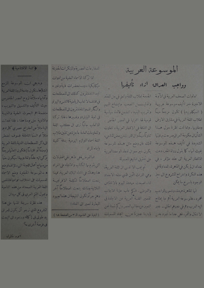 الموسوعة العربية وواجب العراق ازاء تأليفها.