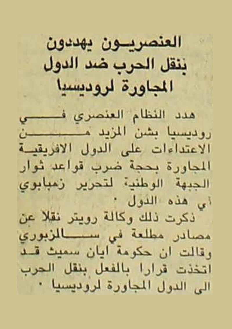 العنصريون يهددون بنقل الحرب ضد الدول المجاورة لروديسيا.