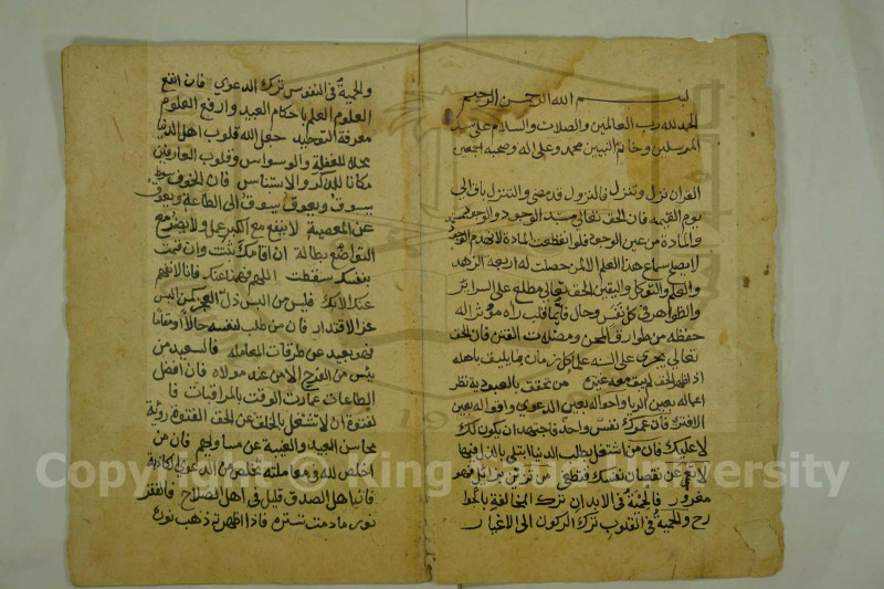 $aاوله : الحمد لله رب العالمين والصلاة والسلام على سيد المرسلين وخاتم النبين محمد وعلى اله وصحبه اجمعين القرآن نزل وتنّزل فالنزول قد مضى والتنّزل باق إلي يوم القيامة الحق تعالى مستبد الوجود والوجود مستمد والمادة من عين الوجود فلو انقطعت المادة لانهدم الوجود لا يصلح سماع هذا العلم إّلا لمن حصلت له أربعة الّزهد والعلم والتوّكل واليقين ...
