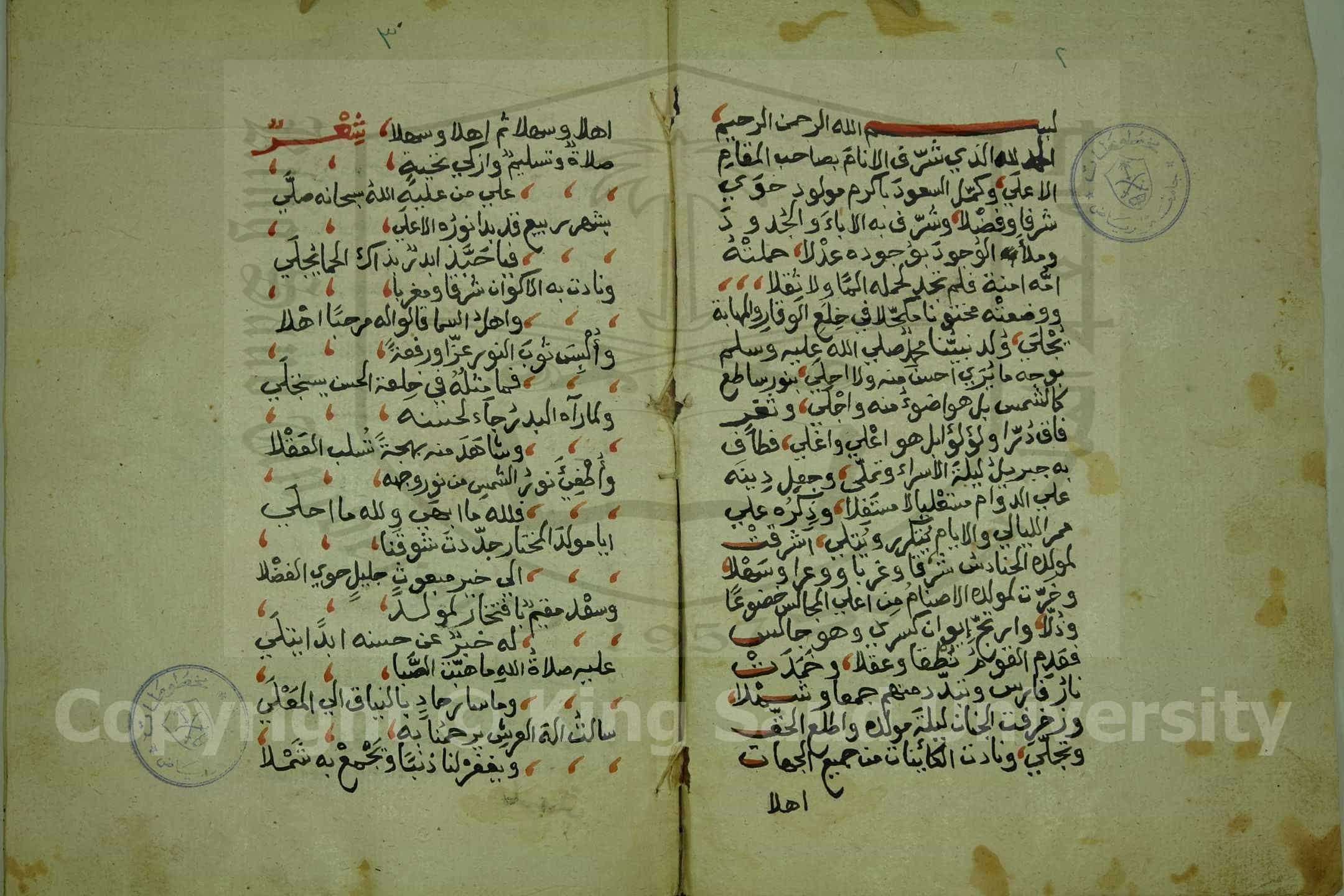 اوله : الحمد الله الذي شرف الأنام وصاحب المقام وكمل السعود بأكرم مولود حوى شرفًا وفضلًا وشرف به الآباء والجدود وملأ الوجود بوجوده...