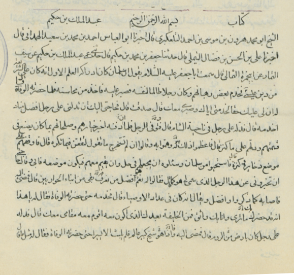 أوله : الشيخ ابو محمد هارون بن موسى بن احمد التلعكبري، قال : أخبرنا احمد بن محد بن سعيد الهمداني قال : أخبرنا علي بن الحسن بن علي بن فضال.