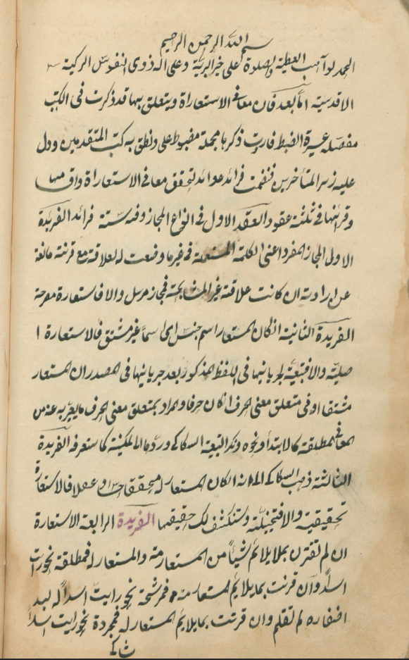 اوله : الحمد لواهب العطية والصلاة على خير البرية وعلى آله ذوي النفوس الزكية الأقدسية أما بعد فإن معاني الاستعارات.