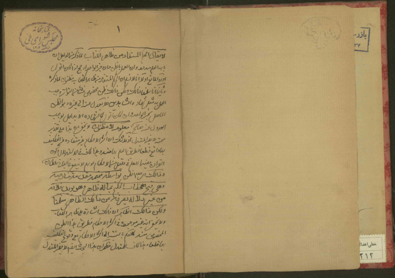 الغلاف : جلد، سمائي مغطى بورق احمر مشجر.