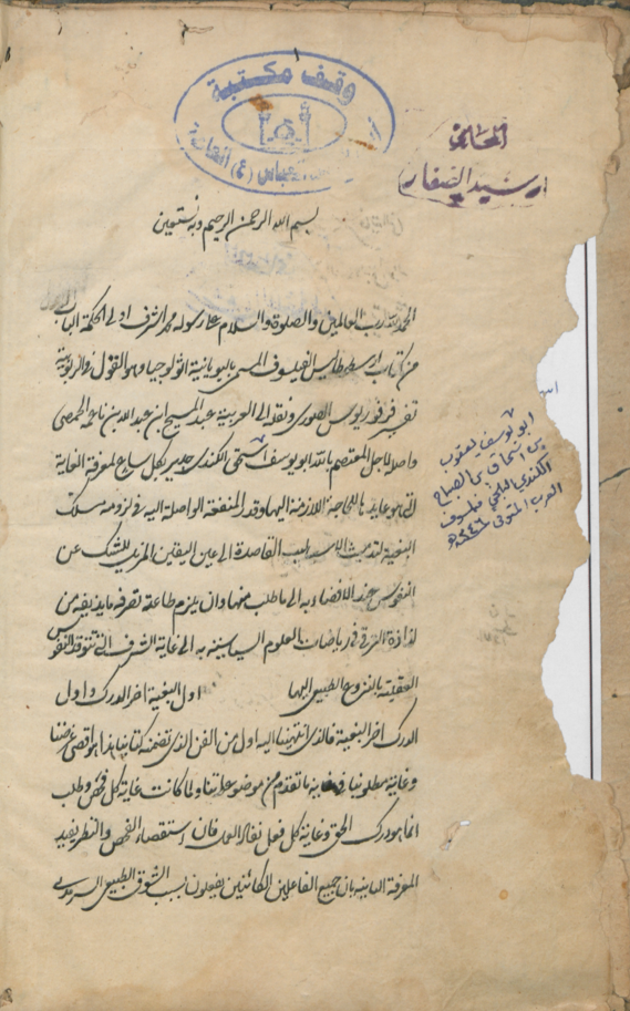 $aاوله : الحمد لله رب العالمين، والصلاة والسلام على رسوله محمد اشرف اولي الحكمة، باب من كتاب اسطو طاليس الفليسوف.