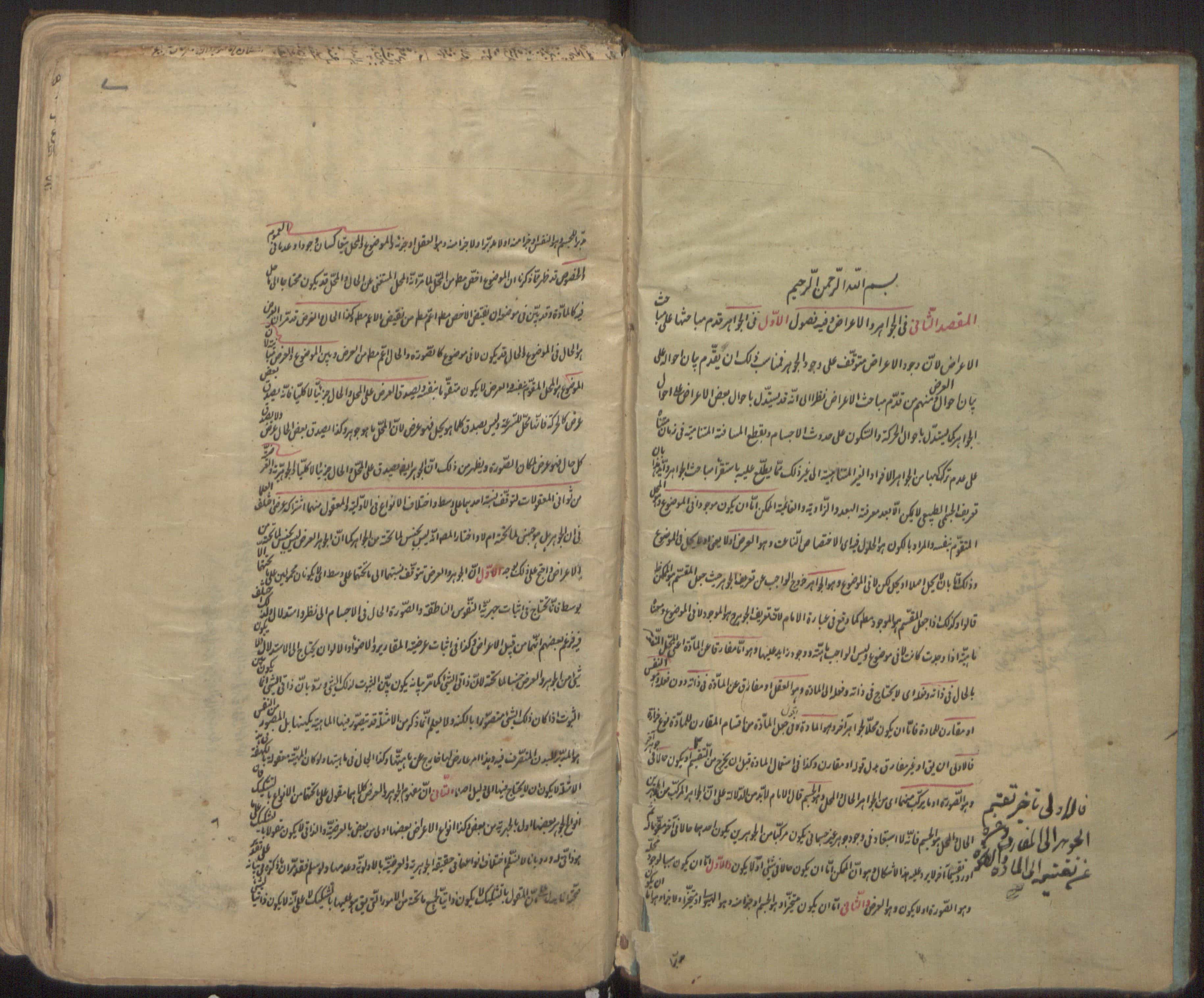 $aأوله : المقصد الثاني، في الجواهر والأعراض، وفيه فصول، الأول في الجواهر، قّدم مباحثها على مباحث الأعراض؛ لان وجود الأعراض متوقف على وجود الجوهر.