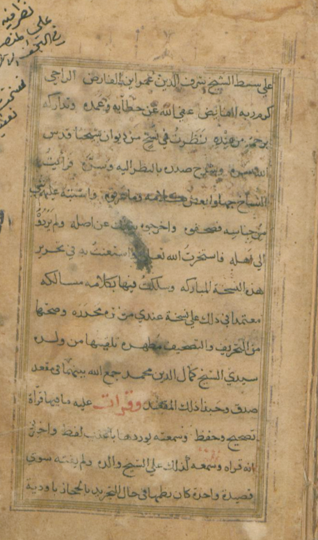 أول النسخة (ناقصة) : علي سبط الشيخ شرف الدين عمر بن الفارض، الراجي كرم ربه الفائض، عفى الله عن خطئه وعمده، وتداركه برحمتٍة من عنده.