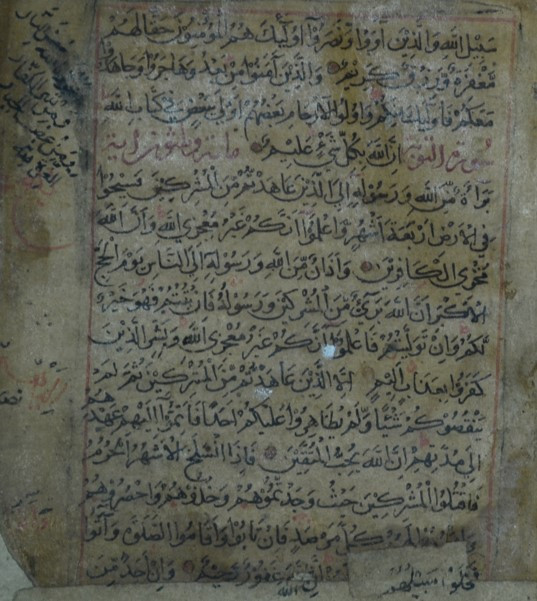 كتبت اسماء السور وعدد الايات بالمداد الاحمر، فواصل الآيات رسمت بشكل دائرة صغيرة حمراء، مجدولة بخط أحمر.