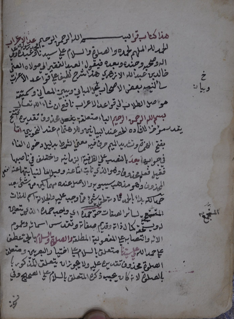 $aأّوله : الحمد لله الملهم لحمده، والصلاة والسلام على سيدنا محمد... وبعد فيقول العبد الفقير الى مولاه الغني خالد بن عبدالله الأزهرّي هذا شرٌح لطيف على قواعد الاعراب سألني بعض الاصحاب...