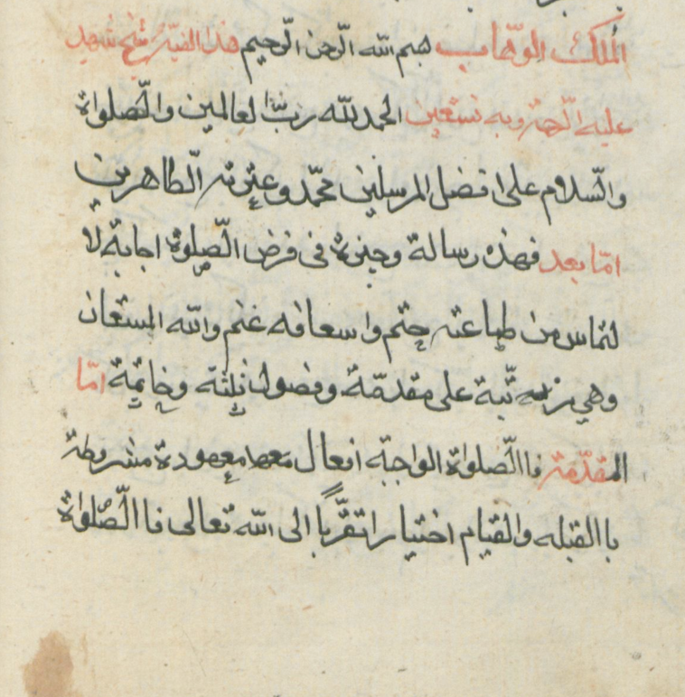 أوله : الحمد لّله رب العالمين... وبعد فهذه رسالة وجيزة في فرض الصلاة اجابة لالتماس من طاعته حتم، واسعافه غنم، والله المستعان...