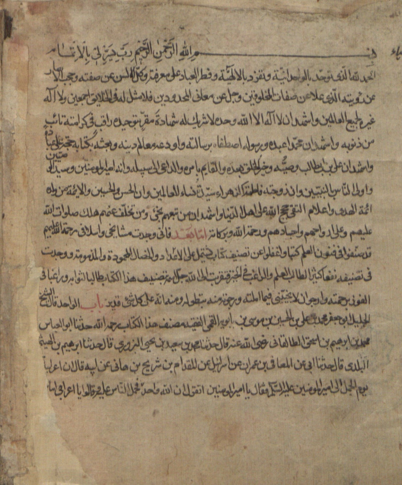 اوله : الحمد لله الذي توحد بالوحدانية، و تفرد بالالهية، وفطر العباد على معرفته؛ وكل الالسن عن صفته؛ و حجب الابصار عن رؤيته...