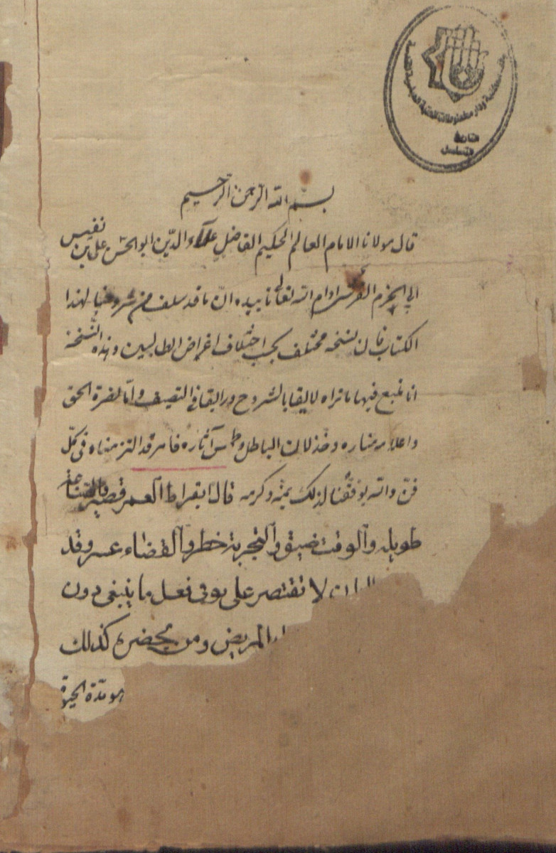 $aاوله : قال مولانا الامام العالم الحكيم الفاضل علاء الدين ابو الحسن علي بن نفيس ابي حزم القرشي ادام الله تعالى تأييده ان ما قد سلف من شروحنا لهذا الكتاب فان نسخه مختلف كاختلاف اغراض الطالبين...